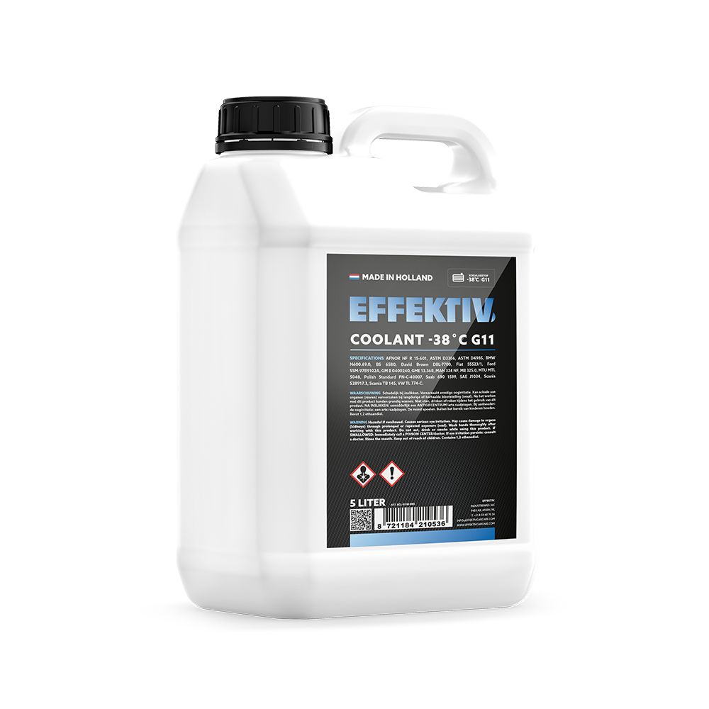 EFFEKTIV Coolant G11 is een ethyleenglycol gebaseerde koelvloeistof voor gebruik in voertuigen. Het maakt gebruik van een Anorganic Acid Technology (IAT)-remmer, is nitriet-, amine- en fosfaatvrij (NAP) en bevat boraat en silicaat. Deze geavanceerde technologie elimineert de vorming van silicaatgel die wordt waargenomen bij inferieure producten. Het biedt totale en permanente bescherming van het koelsysteem en een levensduur van 3 – 4 jaar of 60.000 km tot 85.000 km voor personenauto’s en professionele toepassingen. Ready to use solution.